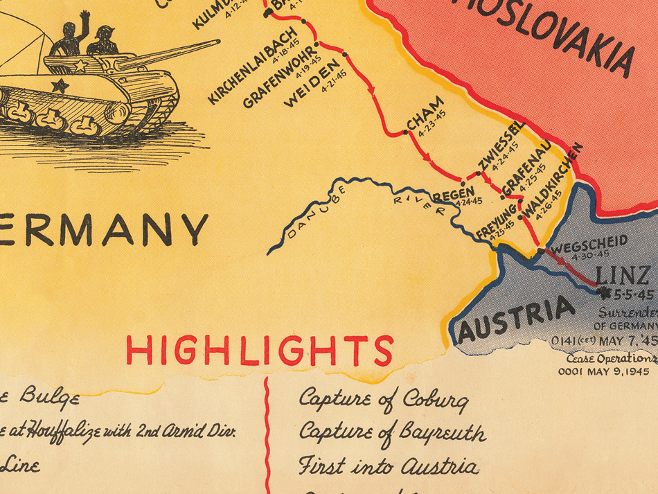 This battle and operations route map charts the journey of the 11th Armored Division during World War II.