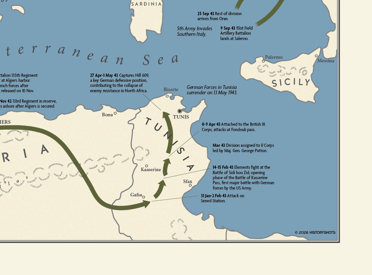 Campaigns of the 34th Infantry Division is a visual history of the Red Bull Division during World War II. The 34th Infantry Division fought in Algeria, Tunisia and Italy from November 1942 to May 1945. It first saw combat in the North African invasion, November 8, 1942, landing at Algiers and seizing the port and outlying airfields. Elements of the Division took part in numerous subsequent engagements in Tunisia during the Allied build-up, notably at Sened Station, Paid Pass, Sbeitla, and Fondouk Gap.