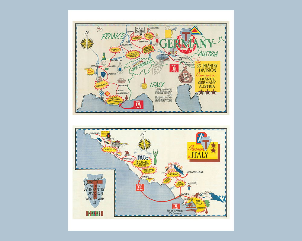 Two maps on one print charts the campaign and operations journey of the 36th Division during World War II.
