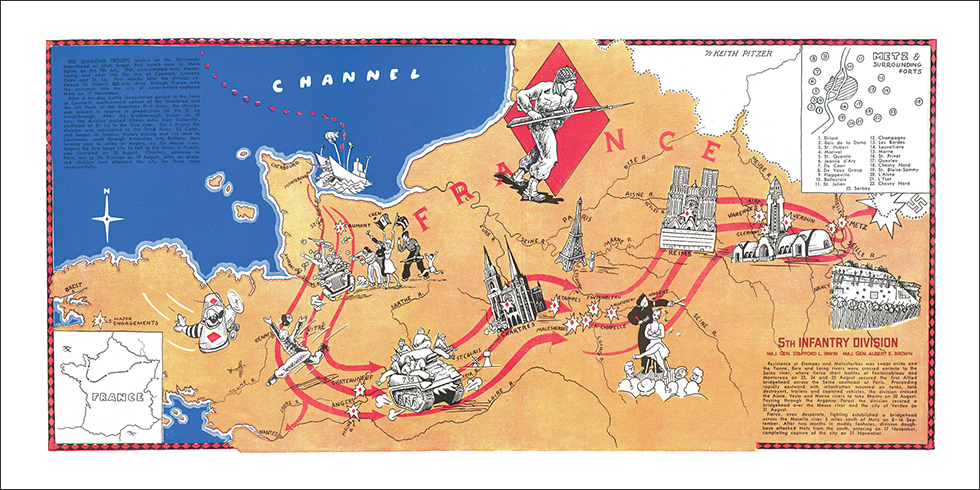 Campaigns of the 5th Infantry Division is a visual history of the Red Diamond division during World War II. The 5th Infantry landed on Utah Beach on 9 July 1944 and concentrated near Montebourg and went into the line at Caumont between Caen and St. Lo.
