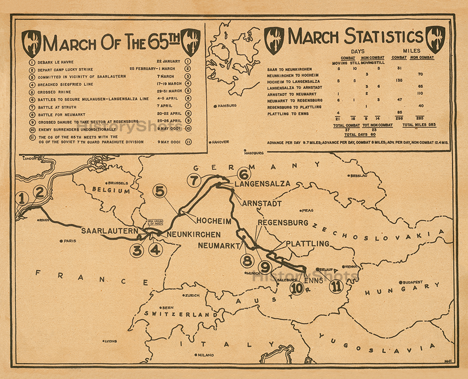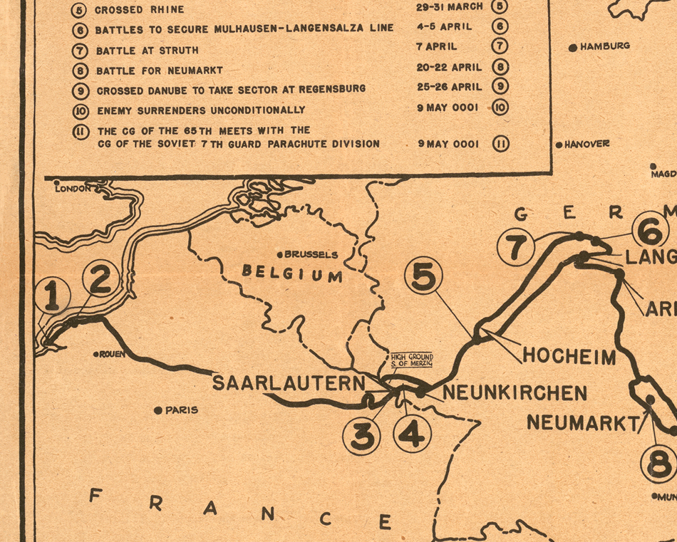 Campaigns of the 65th Infantry Division is a visual history of the Battle Axe division during World War II. The 65th Infantry arrived in France in January 1945 and entered the front line on March 5. The division fought in the Rhineland and Central Europe campaigns.