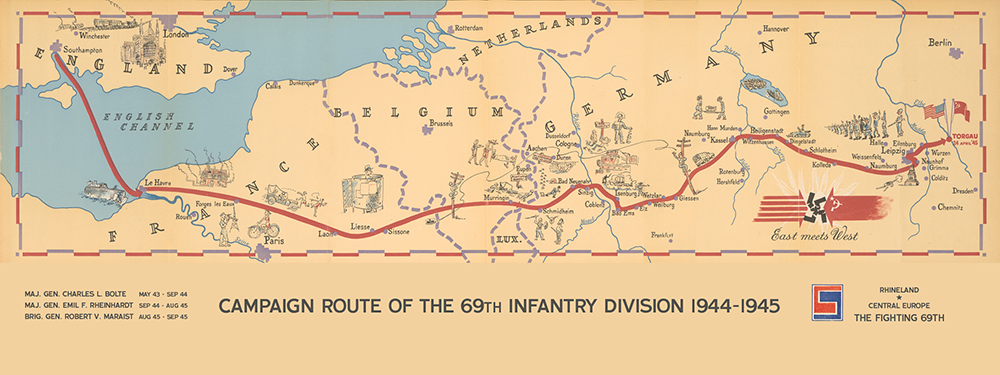 This battle and operations route map details the journey of the 69th Infantry Division during World War II. The 69th Infantry Division landed in Le Havre, France, 24 January 1945 and fought in the Rhineland and Central Europe campaigns.