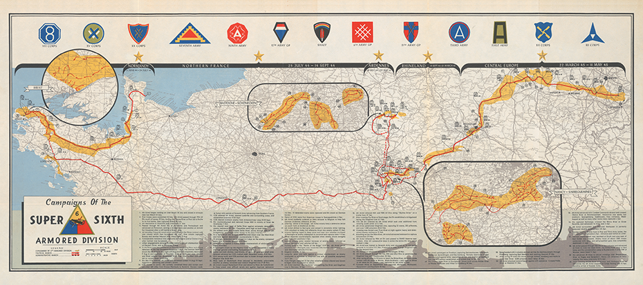 Campaigns of the Super Sixth 6th Armored Division during World War II is a stunning visual history of the division during the war. Along with the detailed map showing the march of the 6th Armored throughout France and Germany, it has a set of military corps, army and army group badges at the top. At the bottom is a complete description of the essential movements and actions from initial landing to the end of the war.