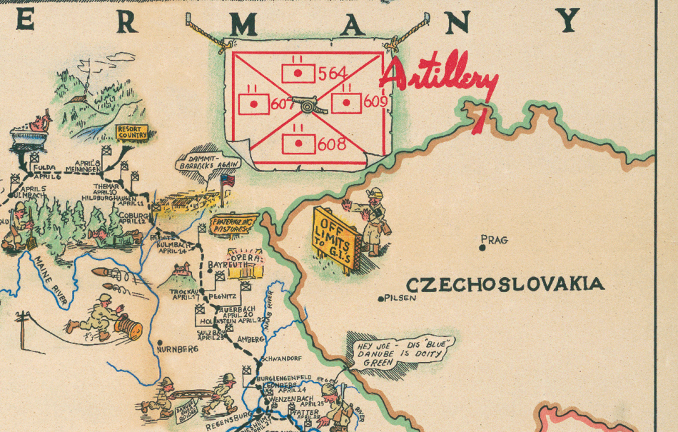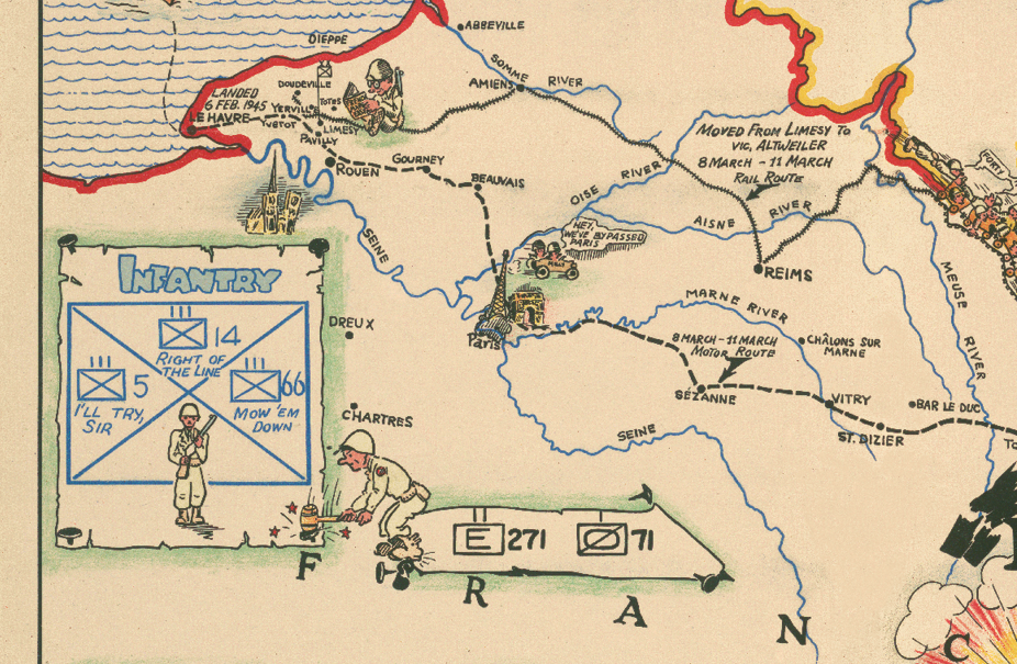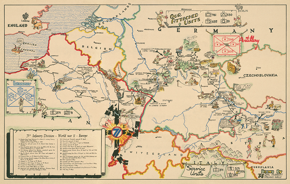 This classic map of the World War II operations of the 71st Infantry Division was drawn by Emil Albrecht and Roland Wille in 1946. Albrecht served as a draftsman in the headquarters section of the 71st Infantry Division.