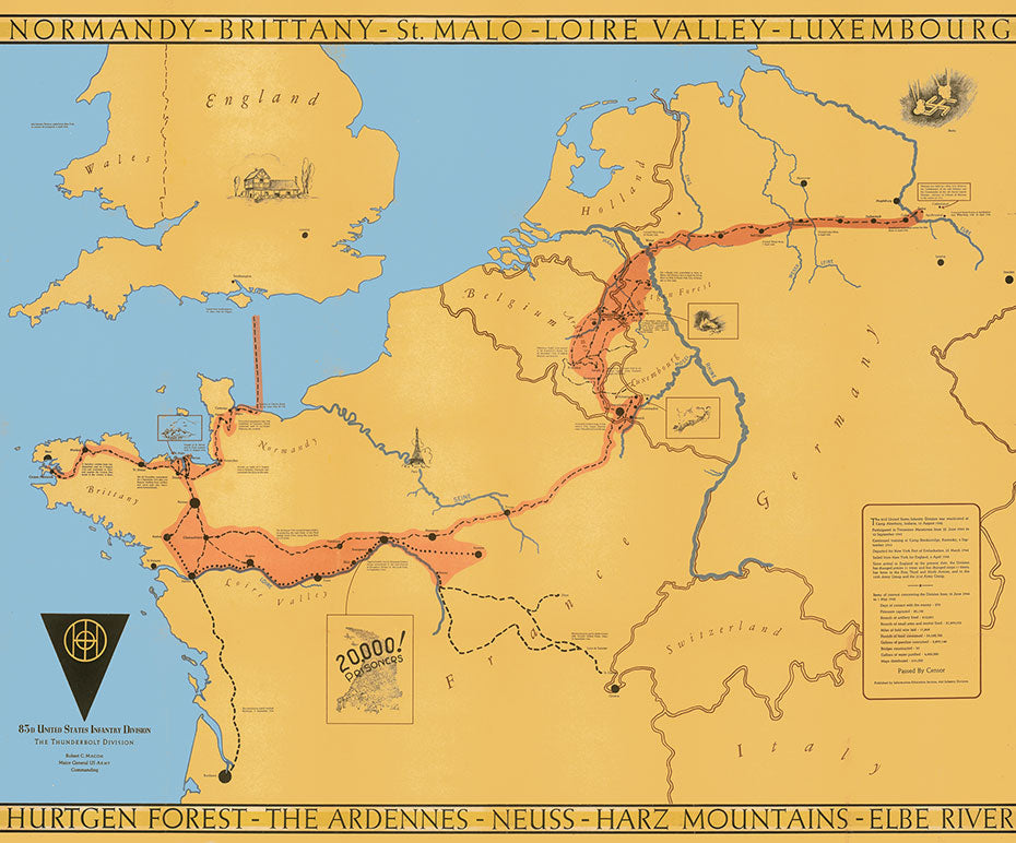 This campaign map shows the route of the 83rd Infantry Division throughout Europe during World War II. The division fought in the Normandy, Northern France, Rhineland, Ardennes-Alsace, and Central Europe campaigns.