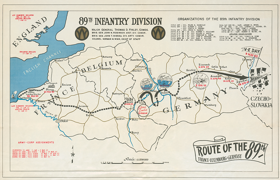 This print is a beautiful and colorful World War II route map of the 89th Infantry Division, known as the Rolling W division. Three and a half months after landing in France, the 89th division came to a halt within a few miles of the Czechoslovakian border in Saxony.