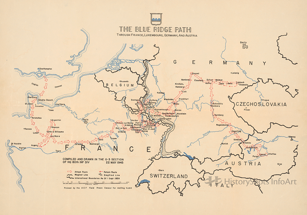 The 80th Infantry Division, known as the Blue Ridge Division, landed on Utah Beach in France during the first week of August 1944. The division spent 239 days in combat on the Western front during World War II and fought in the Northern France, Rhineland, Ardennes-Alsace and Central Europe campaigns.