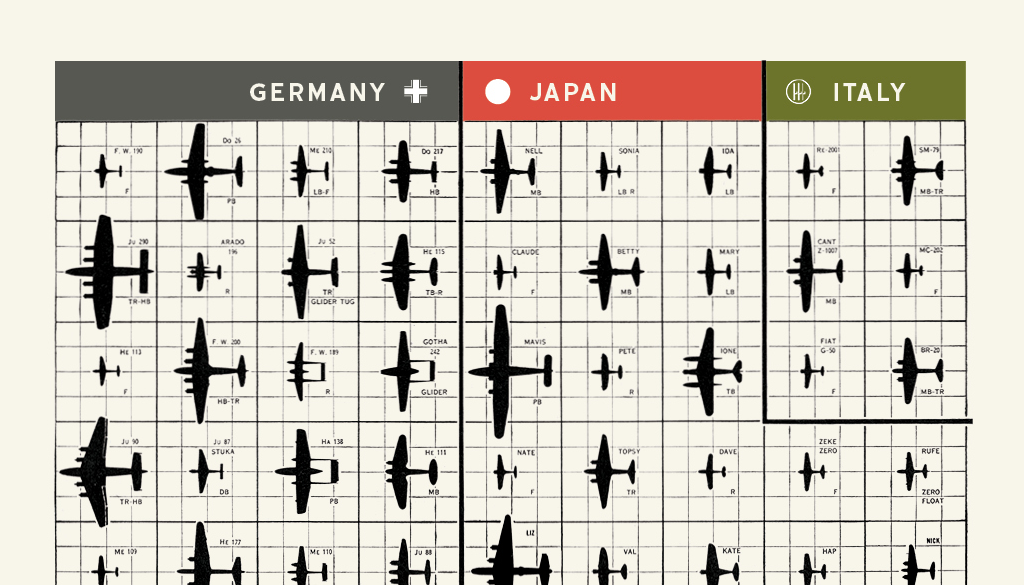 For aircraft, the US government published a recognition manual (and a number of addendums) that combined aircraft from both the Army and the Navy (the independent US Air Force was founded after the war in September 1947) as well as aircraft from the UK, USSR, Germany, Japan, and Italy. We've combined the best silhouette collections from these guides to provide a visual history of WW II aircraft allowing you to uncover fascinating technology and compare the air forces deployed by all the major combatants.