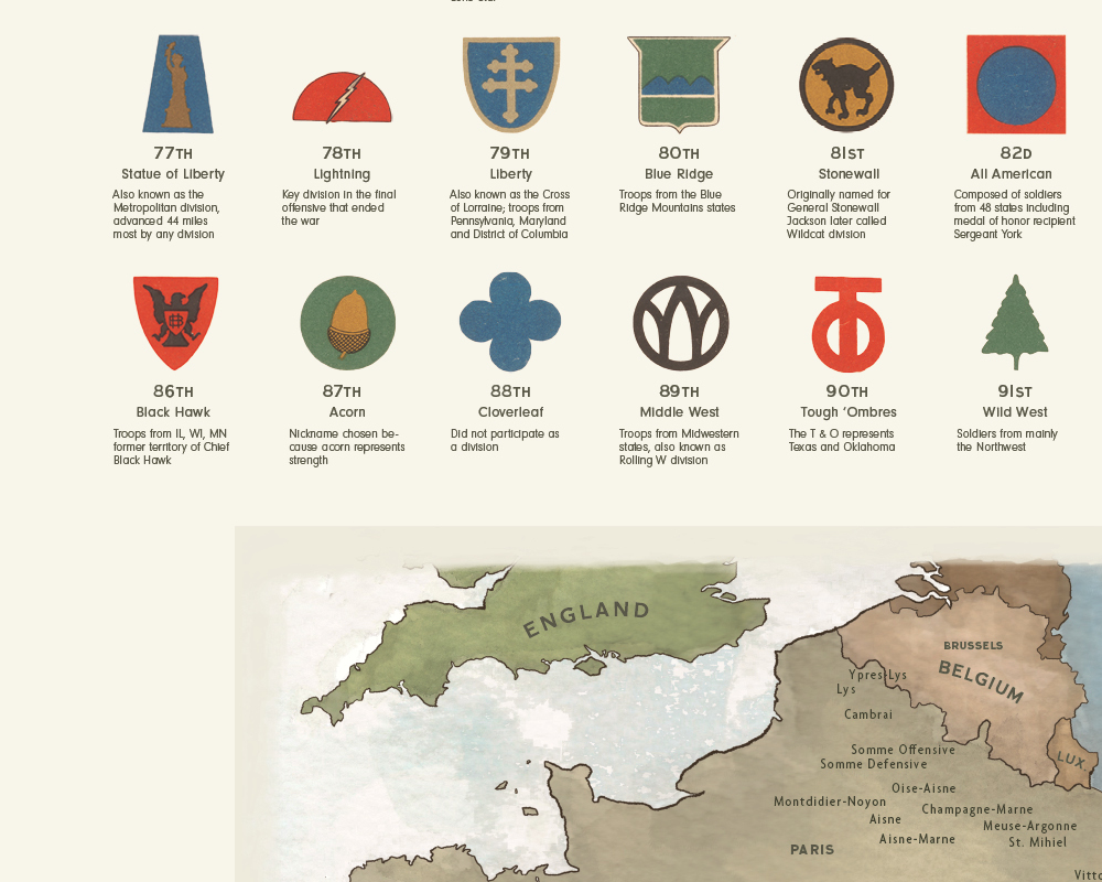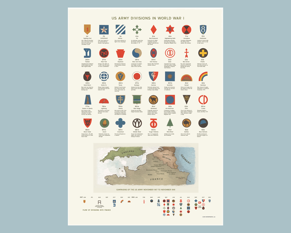 Created In memory and honor of the 100th anniversary of World War I, the US Army in World War I displays the insignia and badges of the 40 US Army Divisions that served during the First World War.