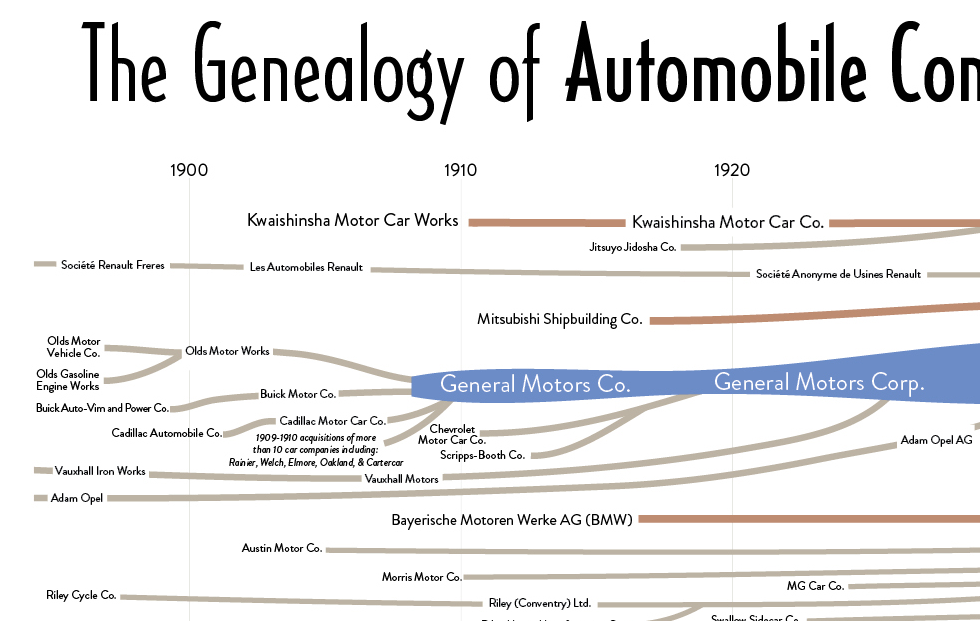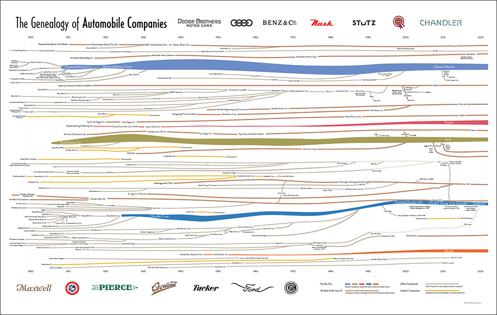 130 years of visual history of more than 100 car companies across the span of the automobile industry. From 1900 to 1925 over 3,300 organizations were formed to produce automobiles in the United States. Today, ten companies account for about 90% of all US automobile sales. Genealogy of Automobile Companies is a visual history of this fascinating industry from the Big Five to the small defunct companies. Folded into the genealogy is the relative market share of US sales for each company.
