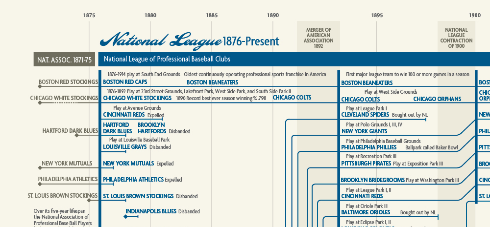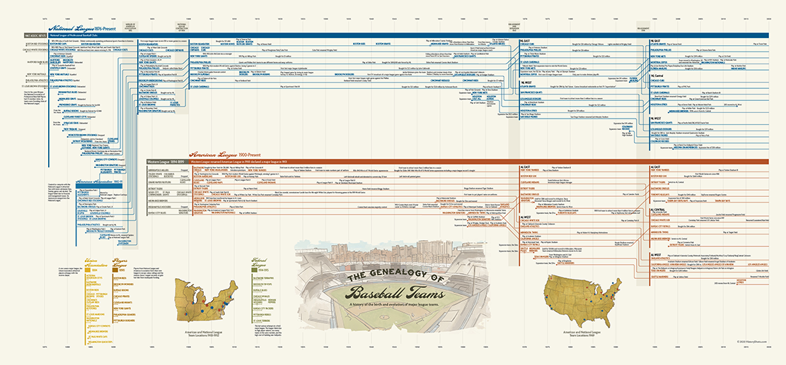 Mapping the history of more than 100 teams and their ballparks over the past 145 years, this print includes baseball teams from the National League, American League, American Association, Federal League, Players League and Union Association.